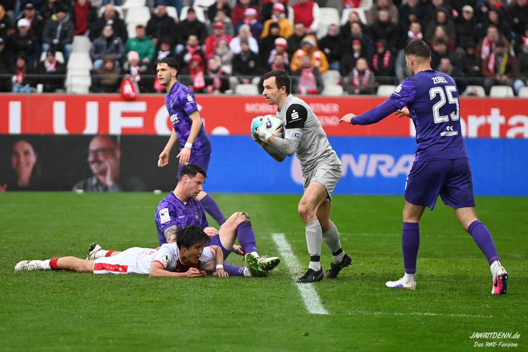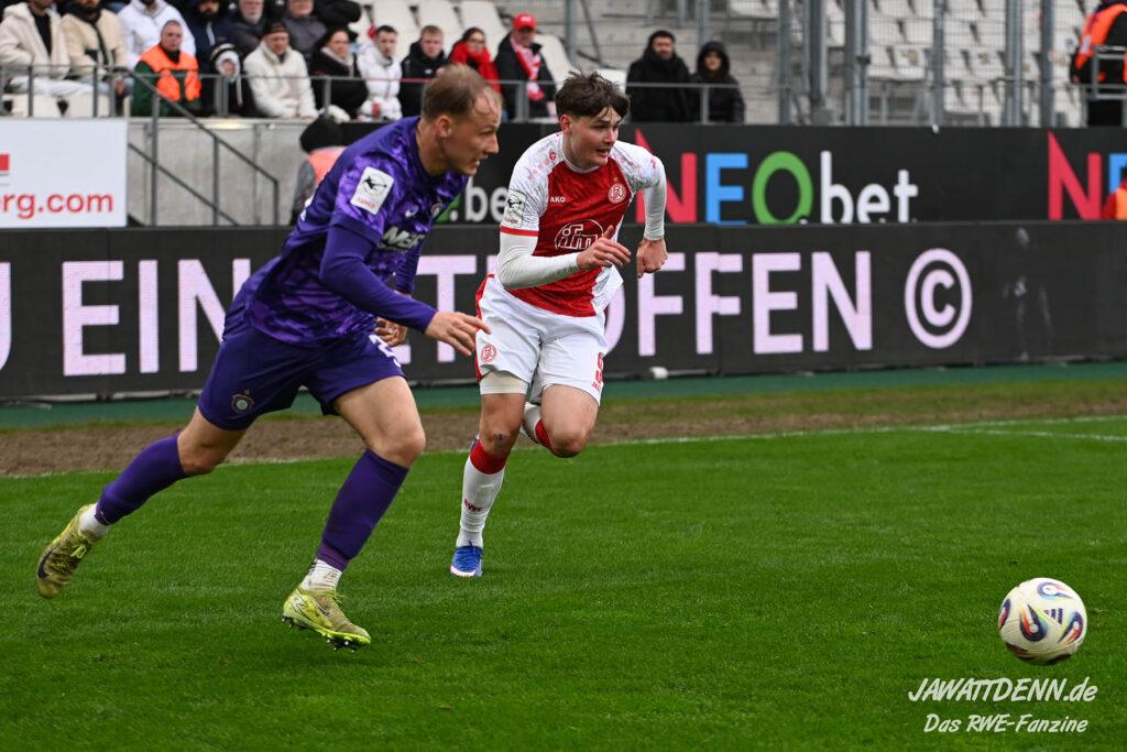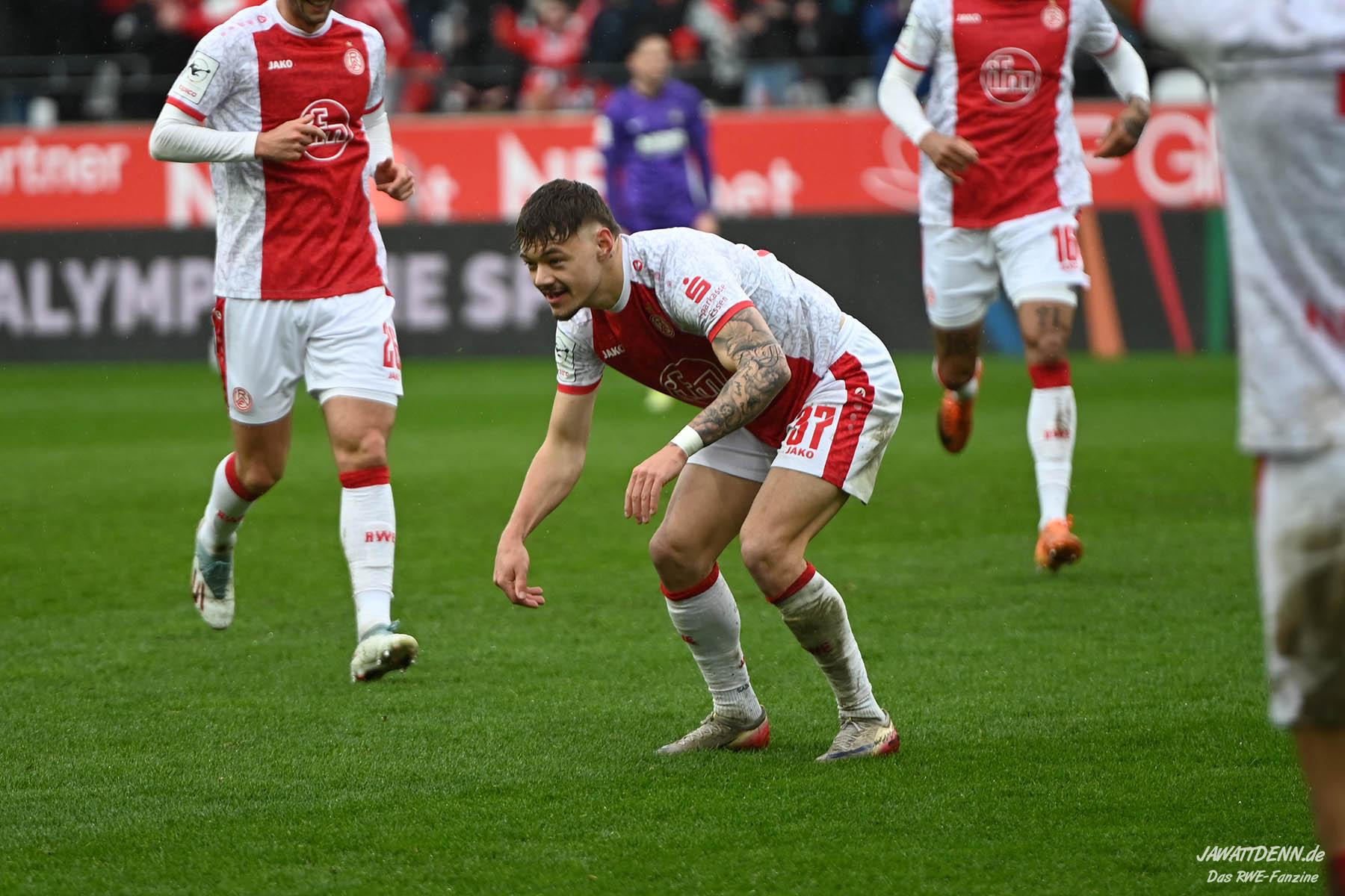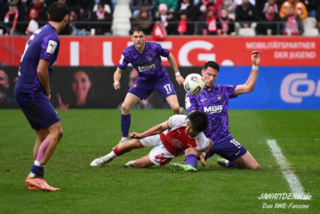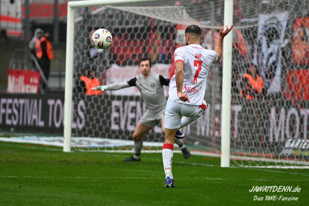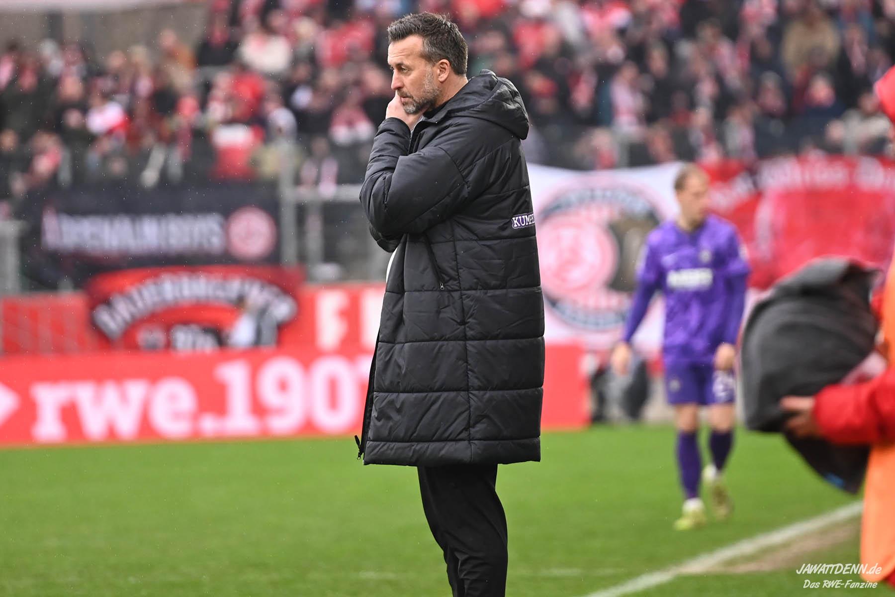 Selbst gegen die zweitschwächste Offensive der Liga schaffte es RWE nicht, hinten sauber zu bleiben. Das erste Gegentor kurz vor der Pause sei noch zu verschmerzen, vielleicht wollte die Mannschaft einfach in diesem Moment zu viel und war zu offen. Allerdings ließ sich auch hier Linksverteidiger Franci Boeubari wie beim ersten Gegentreffer in Hoffenheim zu leicht abkochen. Wie vor einer Woche war auch wieder der andere Außenverteidiger, Jannik Hofmann, in der Verlosung, doch diesmal war es großes Pech, dass er den Schuss von Ehlers abfälschte und dieser über Jakob Golz den Weg ins Tor fand.