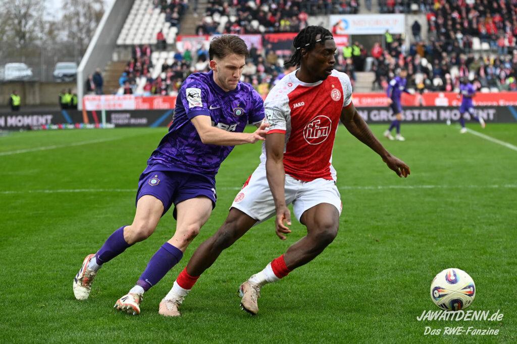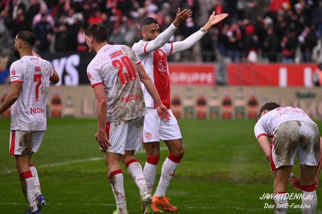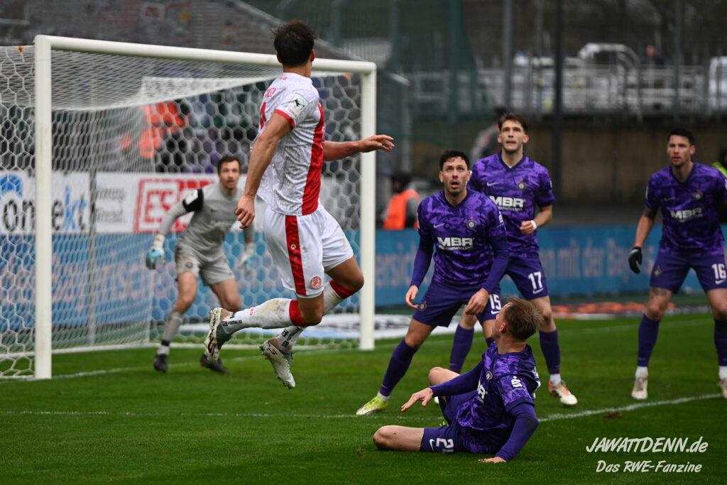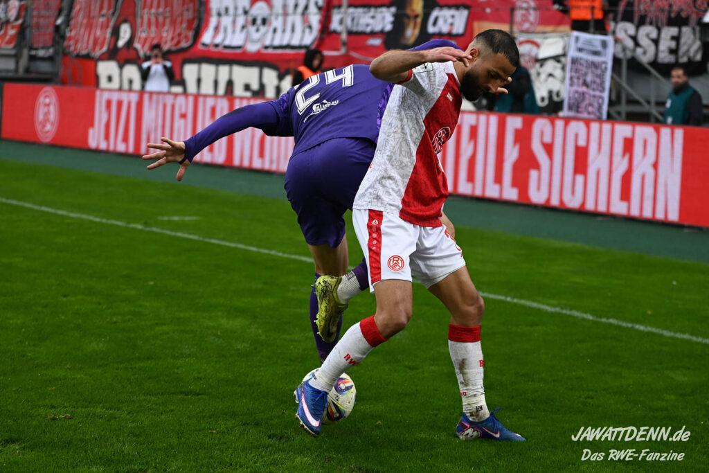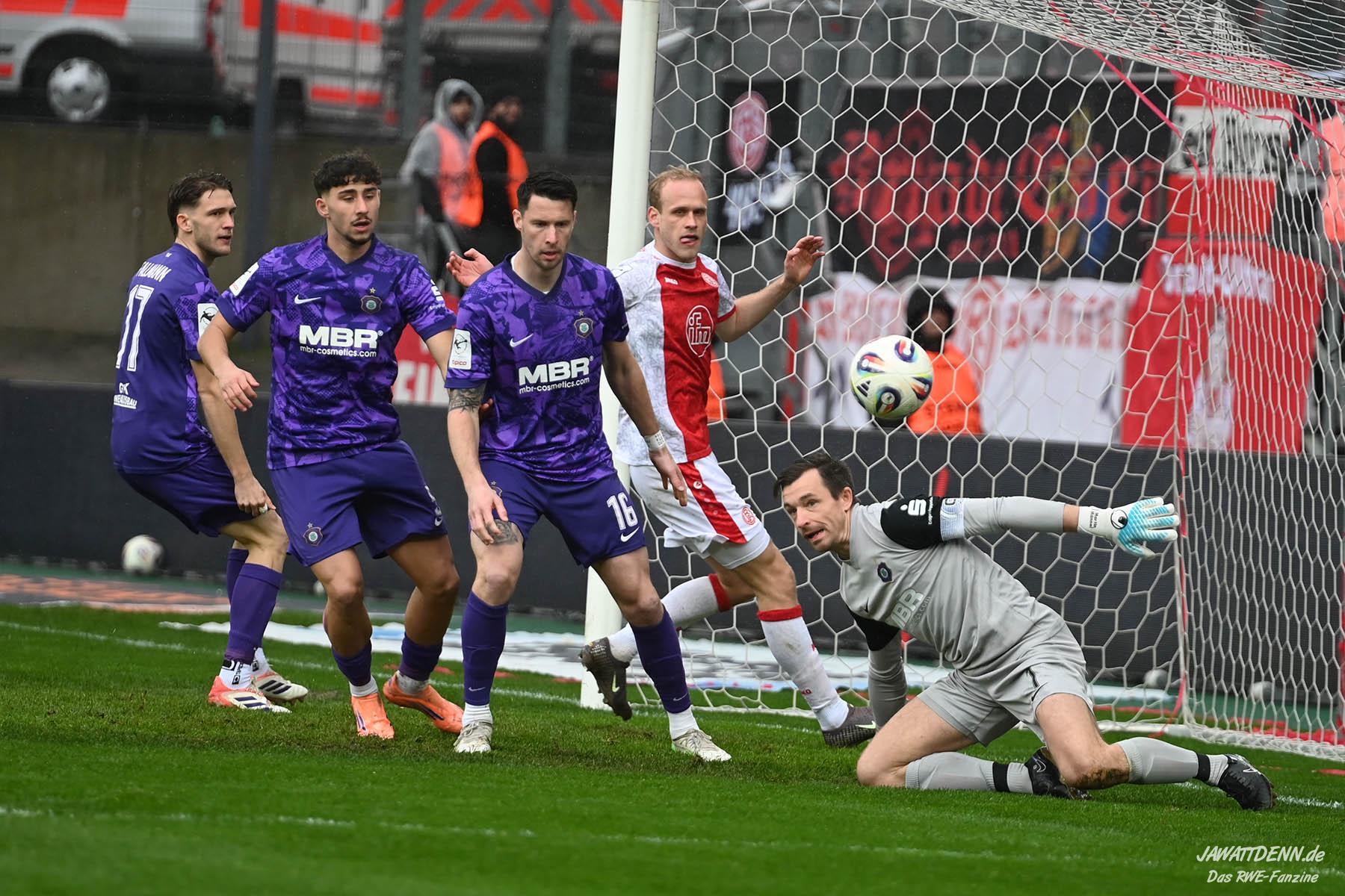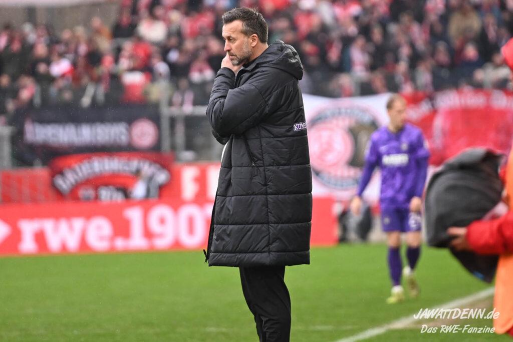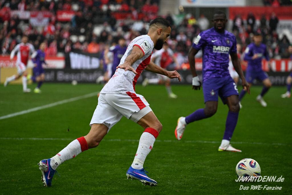Selbst gegen die zweitschwächste Offensive der Liga schaffte es RWE nicht, hinten sauber zu bleiben. Das erste Gegentor kurz vor der Pause sei noch zu verschmerzen, vielleicht wollte die Mannschaft einfach in diesem Moment zu viel und war zu offen. Allerdings ließ sich auch hier Linksverteidiger Franci Boeubari wie beim ersten Gegentreffer in Hoffenheim zu leicht abkochen. Wie vor einer Woche war auch wieder der andere Außenverteidiger, Jannik Hofmann, in der Verlosung, doch diesmal war es großes Pech, dass er den Schuss von Ehlers abfälschte und dieser über Jakob Golz den Weg ins Tor fand.