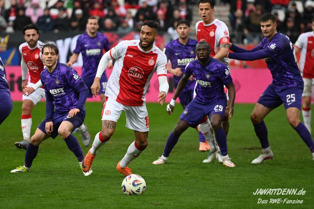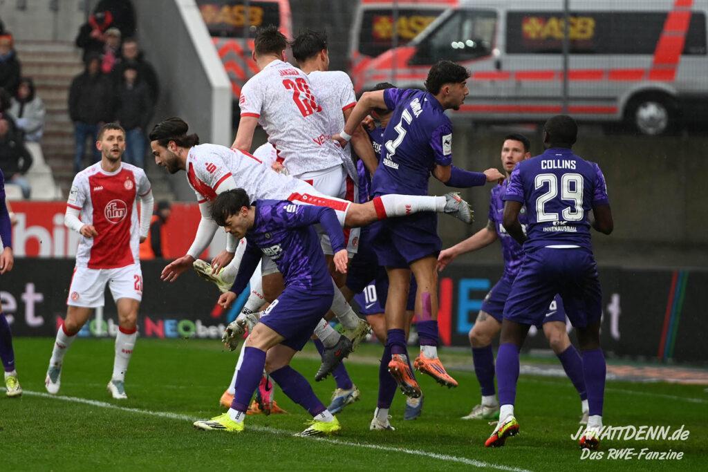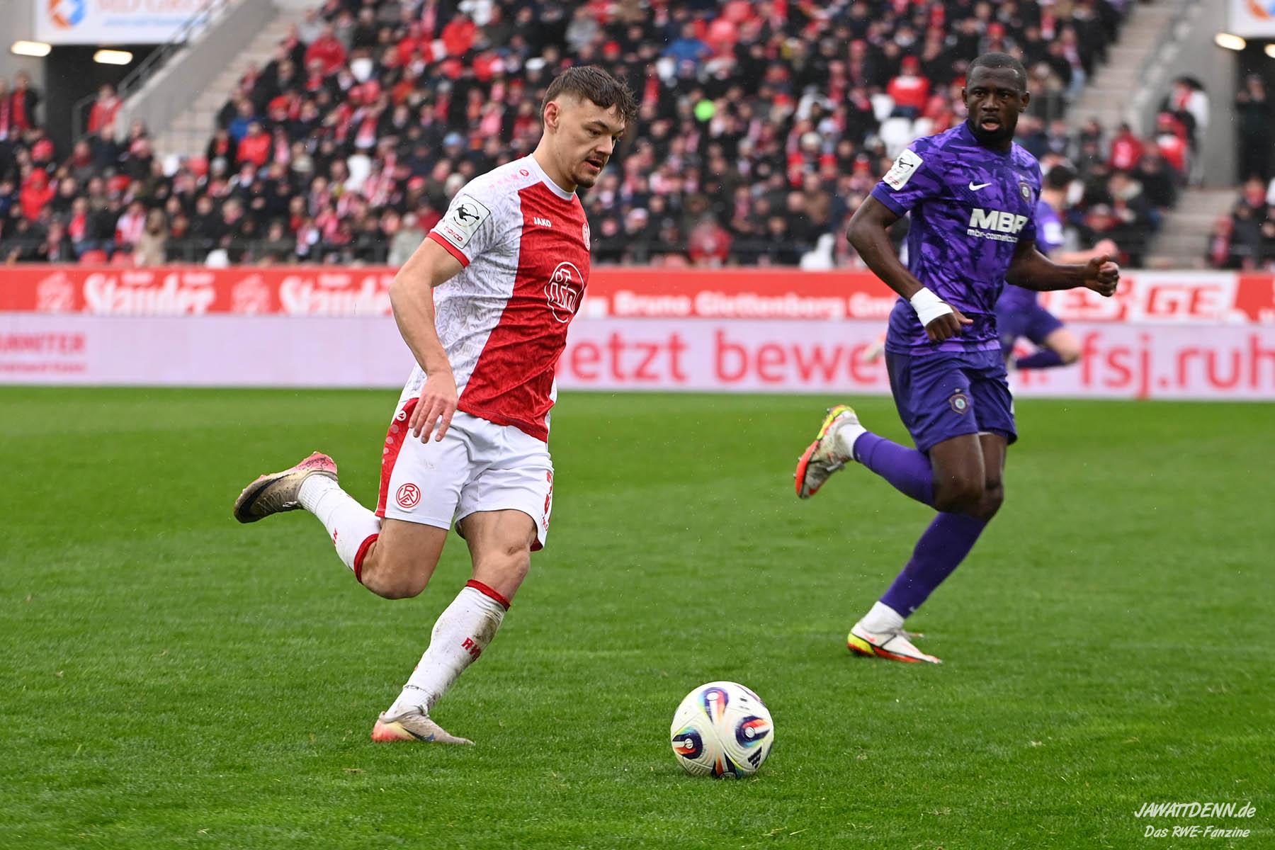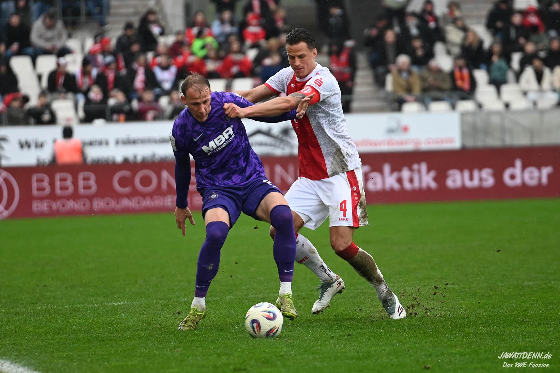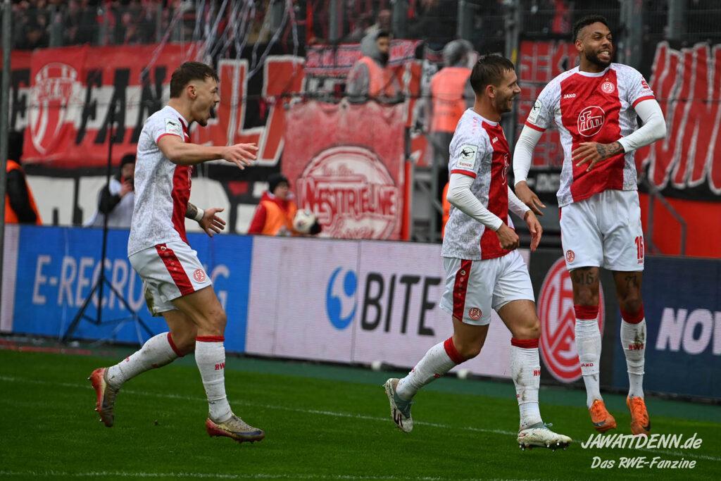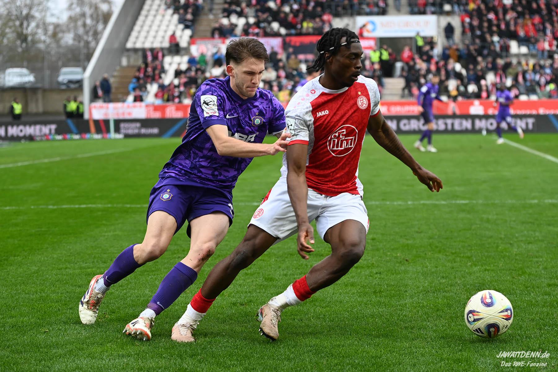 Selbst gegen die zweitschwächste Offensive der Liga schaffte es RWE nicht, hinten sauber zu bleiben. Das erste Gegentor kurz vor der Pause sei noch zu verschmerzen, vielleicht wollte die Mannschaft einfach in diesem Moment zu viel und war zu offen. Allerdings ließ sich auch hier Linksverteidiger Franci Boeubari wie beim ersten Gegentreffer in Hoffenheim zu leicht abkochen. Wie vor einer Woche war auch wieder der andere Außenverteidiger, Jannik Hofmann, in der Verlosung, doch diesmal war es großes Pech, dass er den Schuss von Ehlers abfälschte und dieser über Jakob Golz den Weg ins Tor fand.