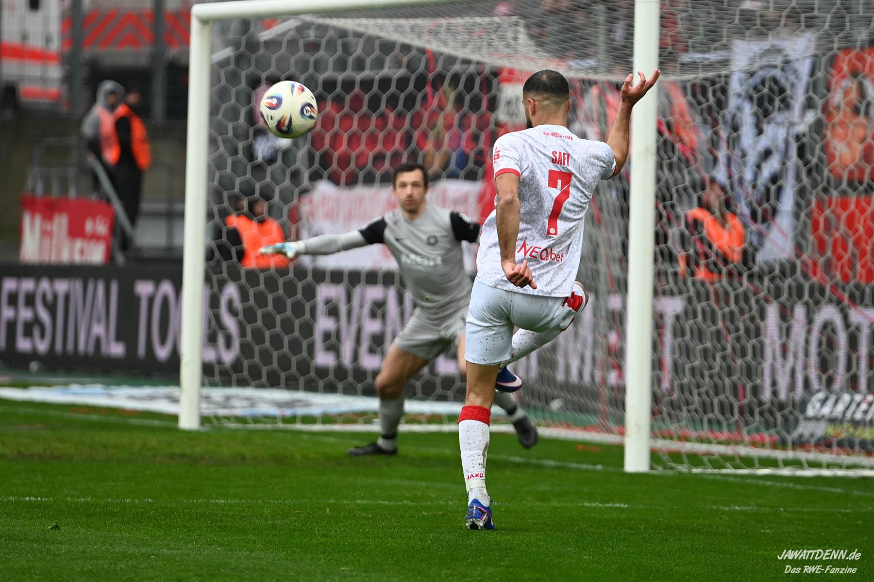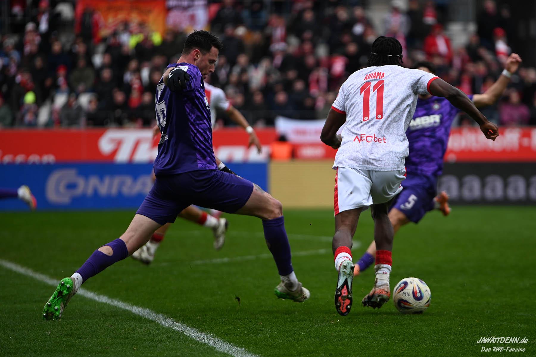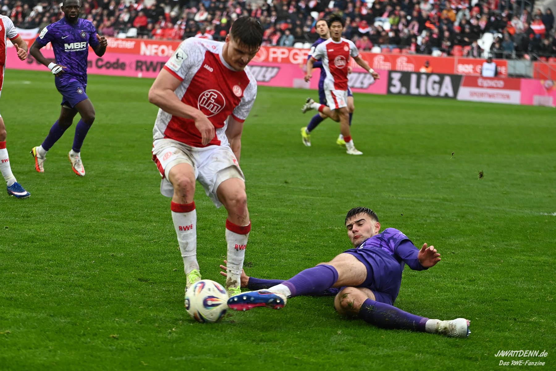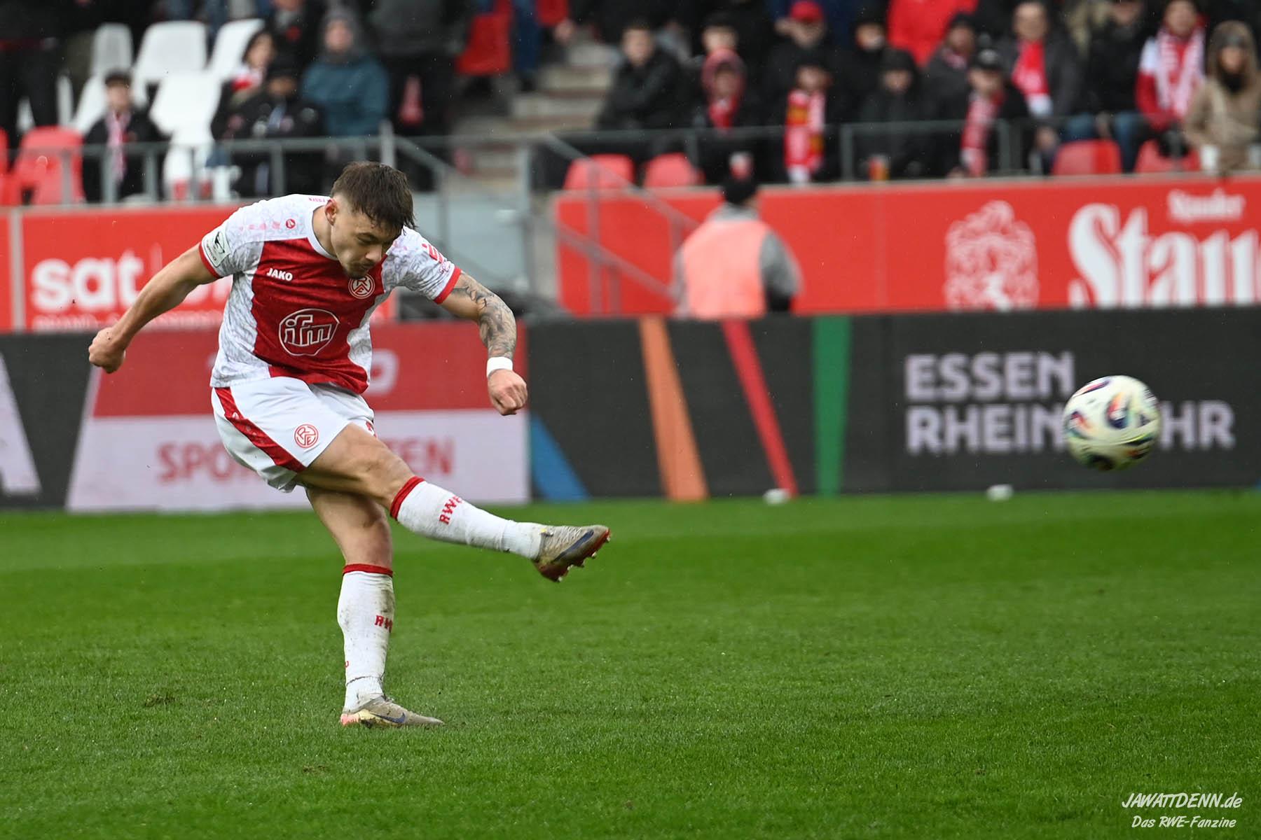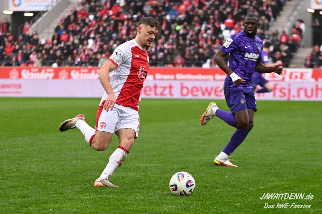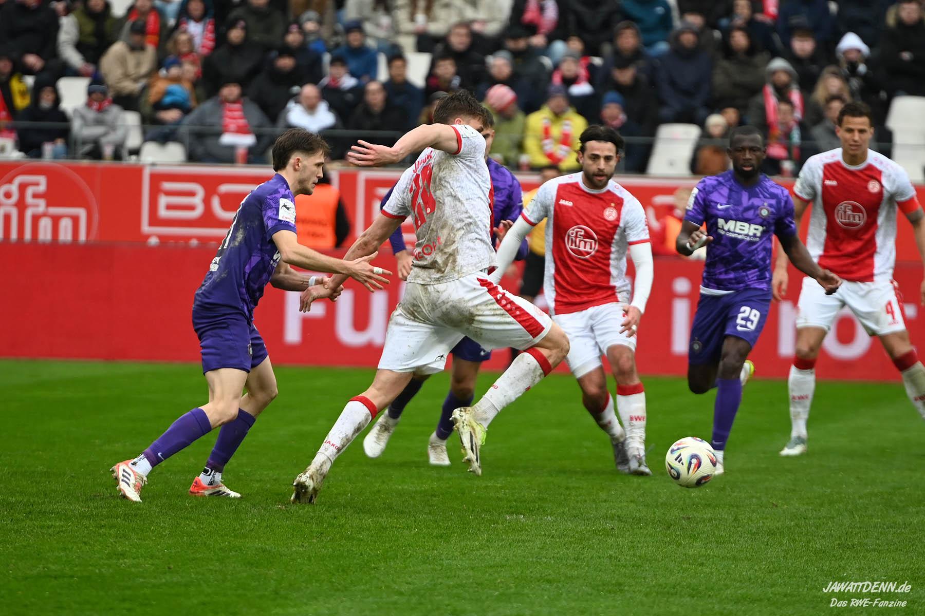 Selbst gegen die zweitschwächste Offensive der Liga schaffte es RWE nicht, hinten sauber zu bleiben. Das erste Gegentor kurz vor der Pause sei noch zu verschmerzen, vielleicht wollte die Mannschaft einfach in diesem Moment zu viel und war zu offen. Allerdings ließ sich auch hier Linksverteidiger Franci Boeubari wie beim ersten Gegentreffer in Hoffenheim zu leicht abkochen. Wie vor einer Woche war auch wieder der andere Außenverteidiger, Jannik Hofmann, in der Verlosung, doch diesmal war es großes Pech, dass er den Schuss von Ehlers abfälschte und dieser über Jakob Golz den Weg ins Tor fand.