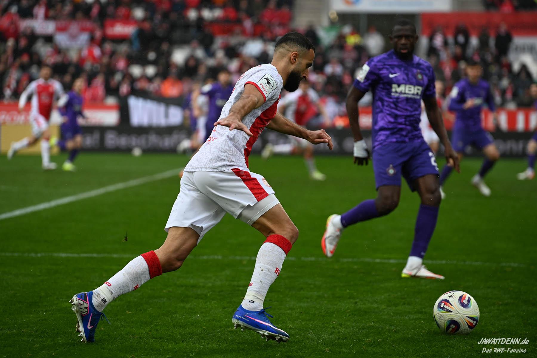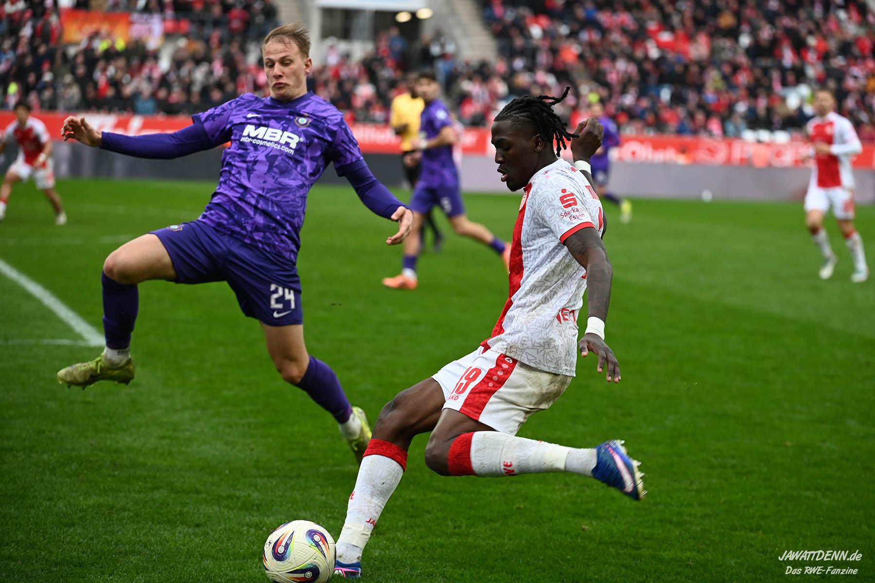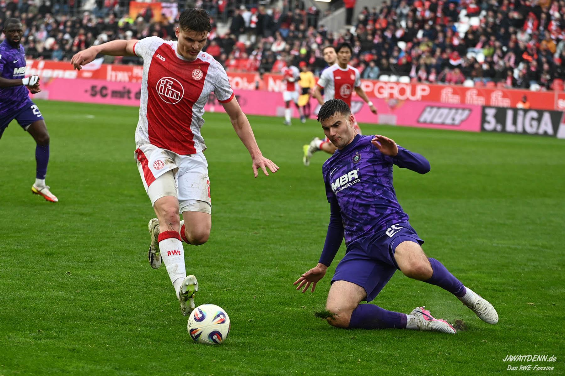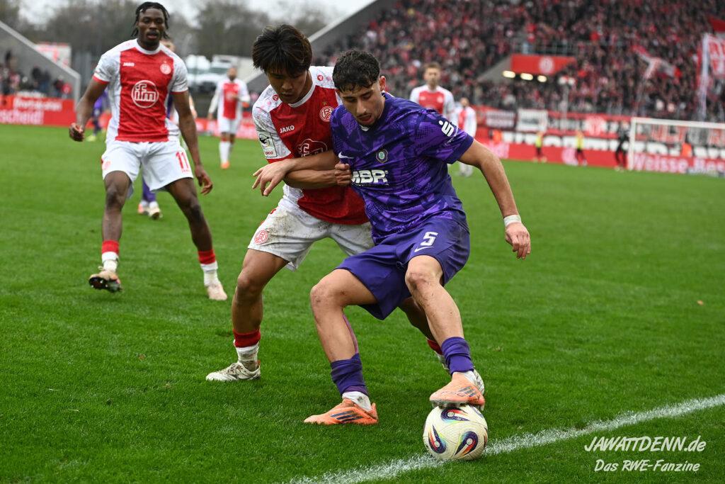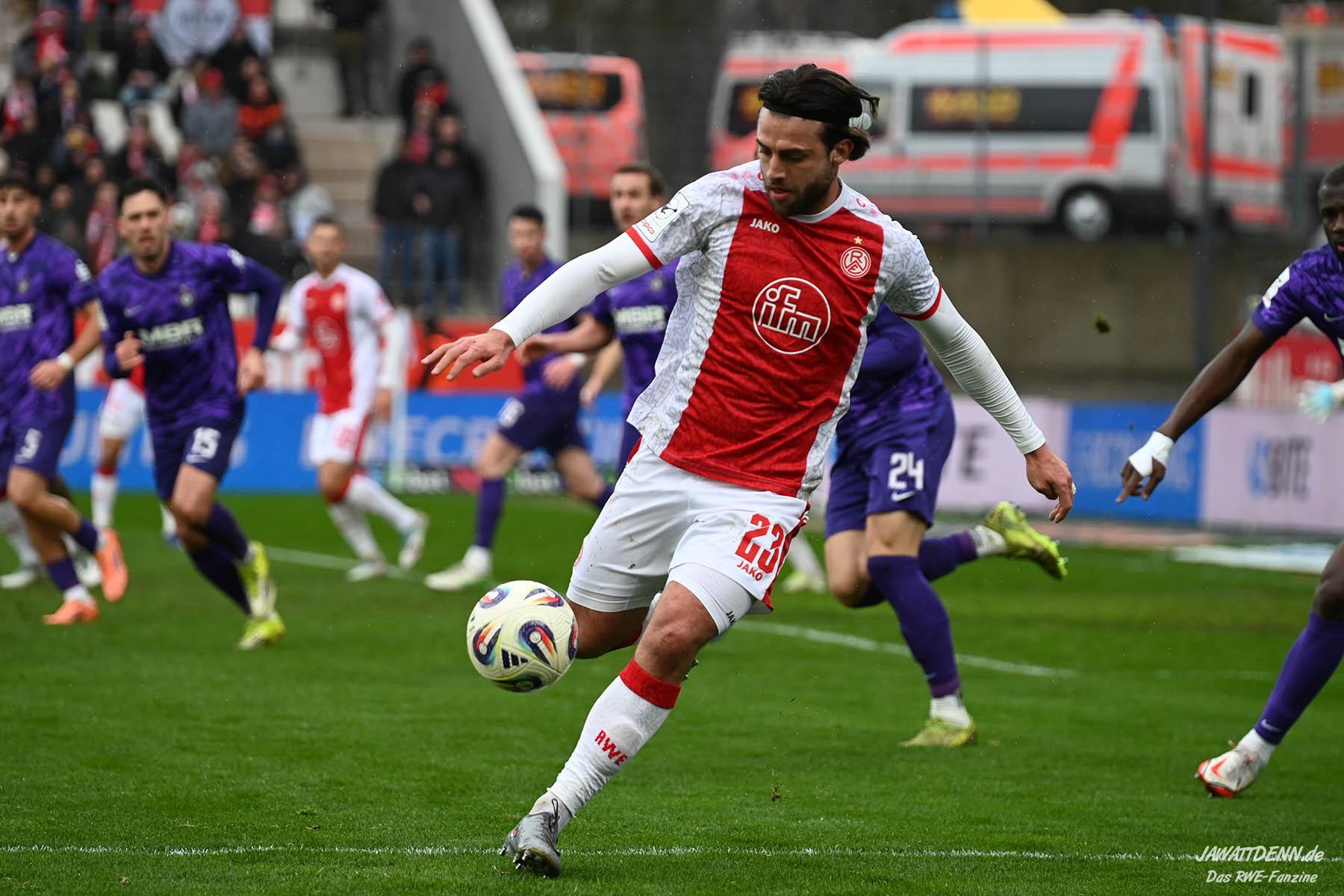Selbst gegen die zweitschwächste Offensive der Liga schaffte es RWE nicht, hinten sauber zu bleiben. Das erste Gegentor kurz vor der Pause sei noch zu verschmerzen, vielleicht wollte die Mannschaft einfach in diesem Moment zu viel und war zu offen. Allerdings ließ sich auch hier Linksverteidiger Franci Boeubari wie beim ersten Gegentreffer in Hoffenheim zu leicht abkochen. Wie vor einer Woche war auch wieder der andere Außenverteidiger, Jannik Hofmann, in der Verlosung, doch diesmal war es großes Pech, dass er den Schuss von Ehlers abfälschte und dieser über Jakob Golz den Weg ins Tor fand.