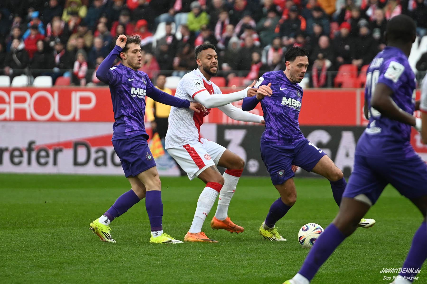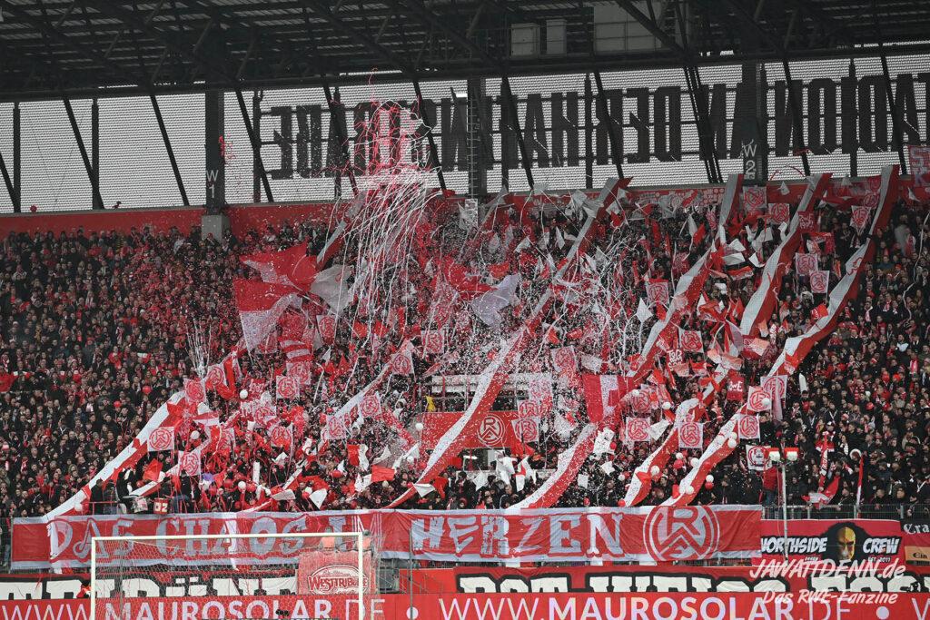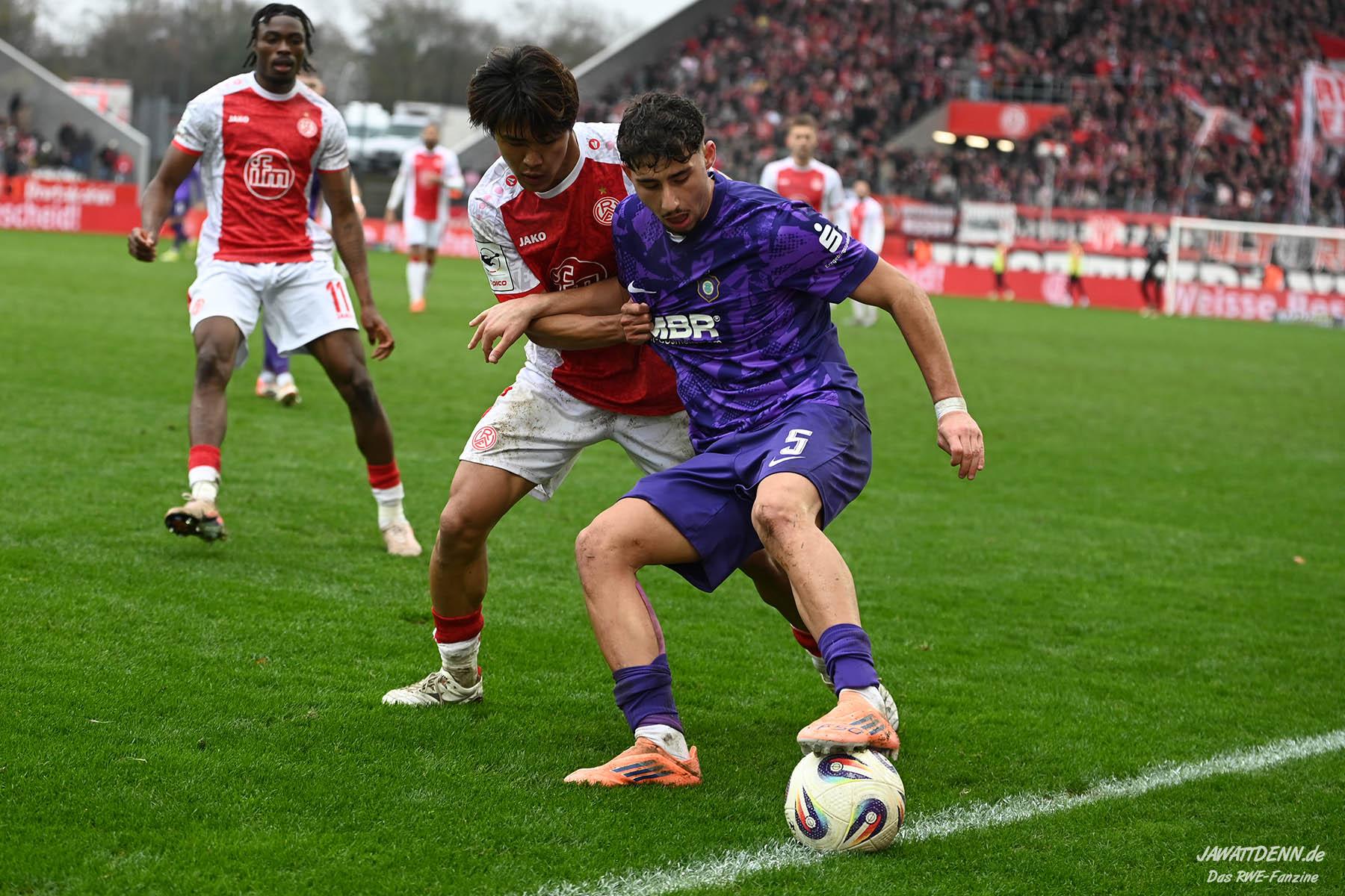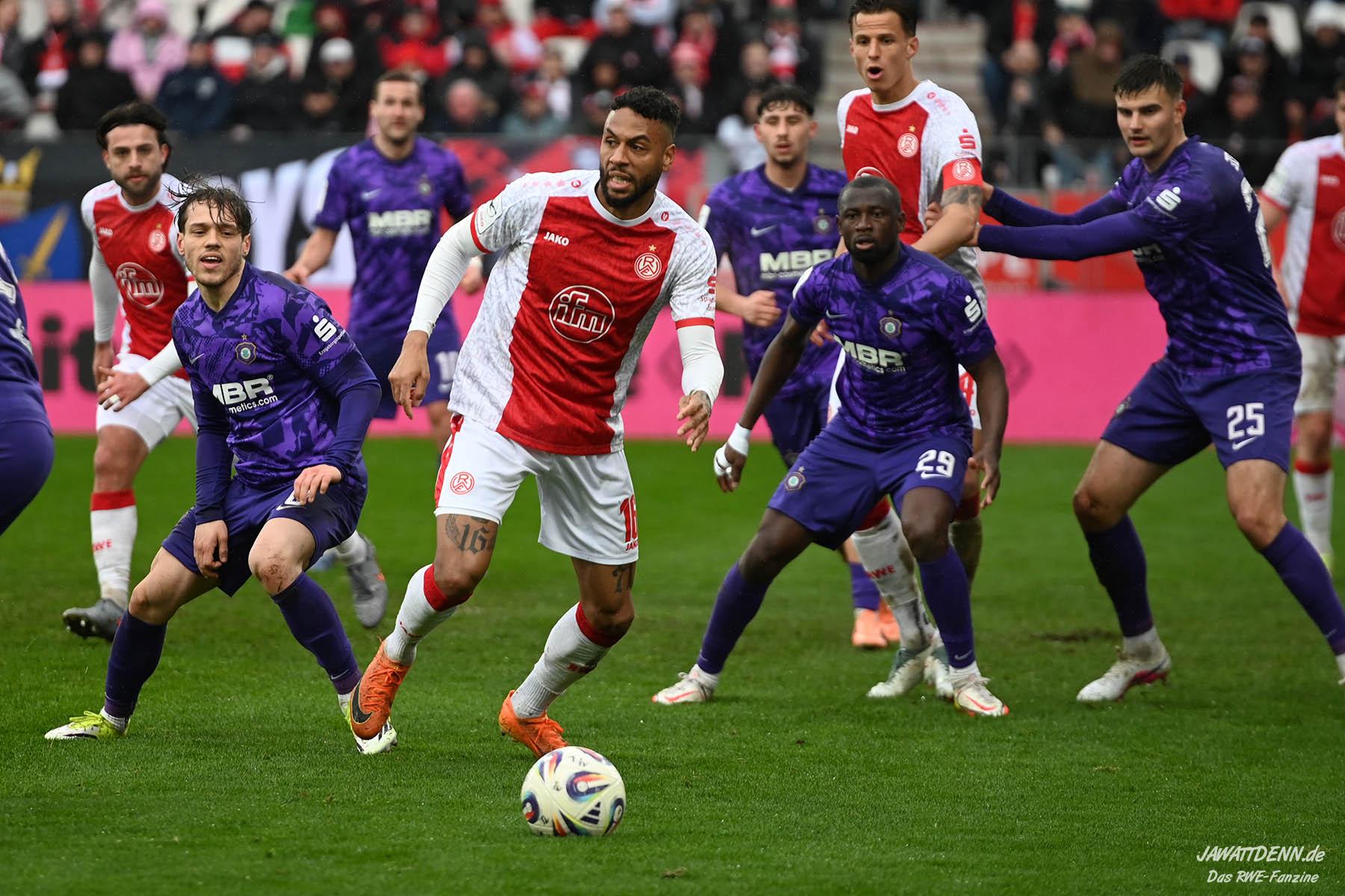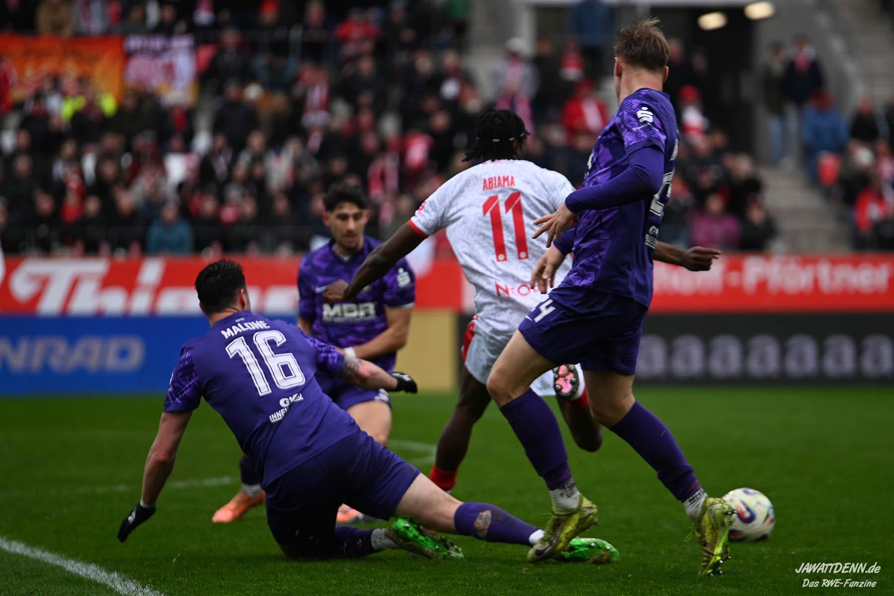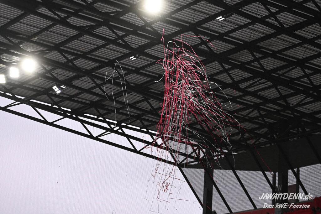 Selbst gegen die zweitschwächste Offensive der Liga schaffte es RWE nicht, hinten sauber zu bleiben. Das erste Gegentor kurz vor der Pause sei noch zu verschmerzen, vielleicht wollte die Mannschaft einfach in diesem Moment zu viel und war zu offen. Allerdings ließ sich auch hier Linksverteidiger Franci Boeubari wie beim ersten Gegentreffer in Hoffenheim zu leicht abkochen. Wie vor einer Woche war auch wieder der andere Außenverteidiger, Jannik Hofmann, in der Verlosung, doch diesmal war es großes Pech, dass er den Schuss von Ehlers abfälschte und dieser über Jakob Golz den Weg ins Tor fand.