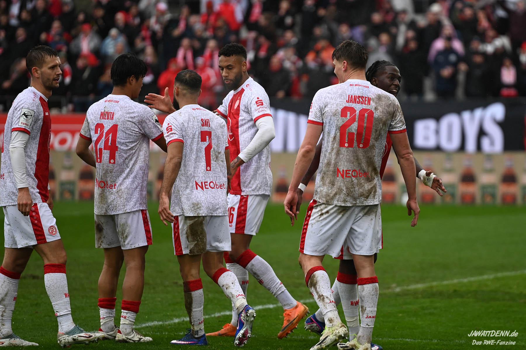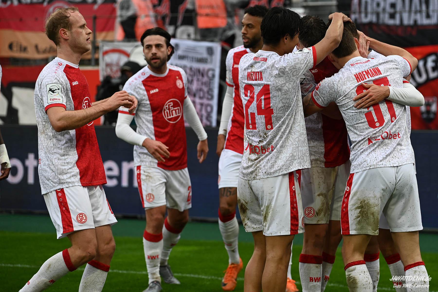 In der 22. Minute hatte Torben Müsel im Sechzehner nach Ablage von Ramien Safi eine gute Abschlussgelegenheit, aber sein Schuss wurde noch entscheidend geblockt. Nur sechs Minuten später war es der eben erwähnte Müsel, der die Hafenstraße das erste Mal zum Beben brachte. In der Folge eines nicht geklärten Freistoßes konnte Rios Alonso den Ball von der rechten Seite noch einmal scharf machen, auch dessen Flanke kann nicht richtig geklärt werden, so dass Ruben Reisig das entscheidende Kopfballduell gewinnen konnte und Müsel bediente, der im Rücken zum Tor aus fünf Metern elegant mit der Hacke vollstreckte. Nach zweidreißig Minuten bediente Lucas Brumme ca. 30 Meter vor dem Tor Jannik Hofmann mit dem vermeintlichen Versuch, einen neuen Angriff zu starten. Der junge Rechtsverteidiger hielt das aber nicht für nötig und zimmerte den Ball aufs Tor, wo dieser hinten dem vergeblich fliegenden Männel in seinen rechten Giebel einschlug. Diese Granate wird sich mit hoher Wahrscheinlichkeit in der Auswahl des Tores des Monats bei der Sportschau befinden. Nicht weniger schön war auch das Tor von Marek Janssen in der 37. Minute, bei dem die Essener in der Zentrale den Ball nach einem etwas kurzen Roller von Männel erobern konnten und Janssen den Ball mit einer Drehung am Sechzehner in das Tor drosch.