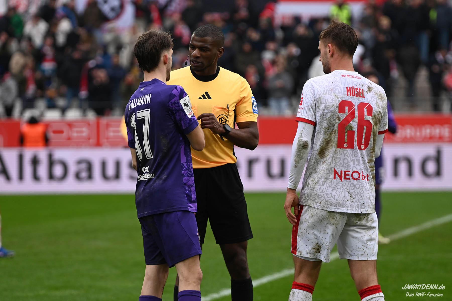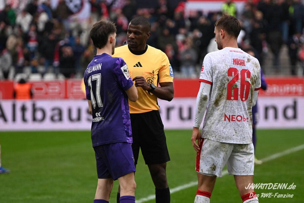Schiedsrichter Assad Nouhoum hatte schon denkwürdige Auftritte unter Beteiligung von RWE, diesmal zeigte der Unparteiische eine solide Partie. Waren vor allem die Entscheidungen in der ersten Halbzeit noch etwas kleinlich, wurde die Linie aber zu Recht etwas großzügiger, da er nicht auf jedes vermeintliche Foulspiel hereinfiel. Einzig die unverständliche Spielverzögerung vor allem durch Torhüter Männel hätte er mehr ahnden müssen. Die einzige gelbe Karte für RWE gegen Franci Bouebari ist vielleicht auch zu milde gewesen, da der Franzose durch den nassen Boden wegrutscht und seinen Gegenspieler voll erwischt. Es ist aber mal erfrischend, dass diese Kategorie aus Essener Sicht auch mal so kurz sein kann.