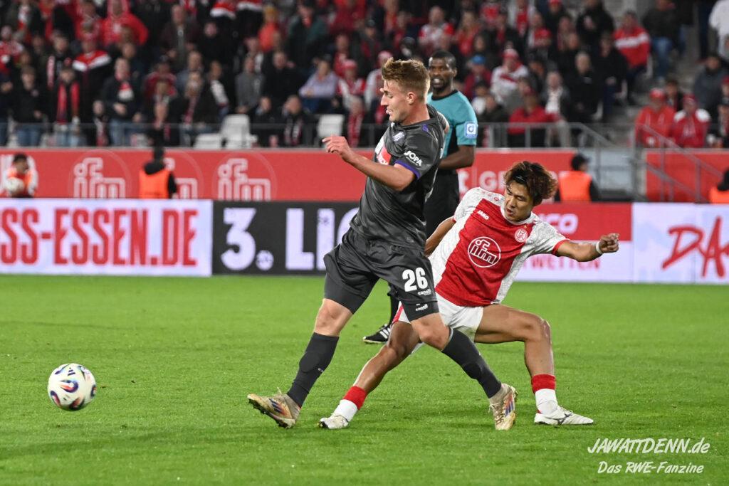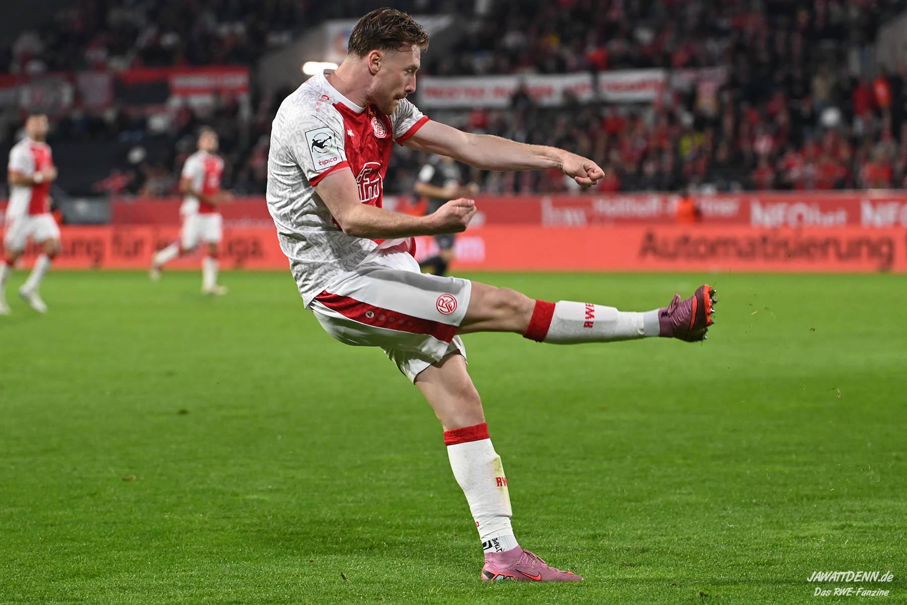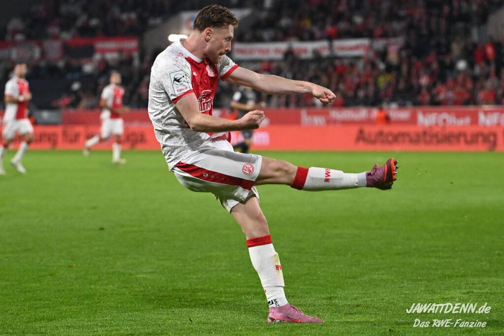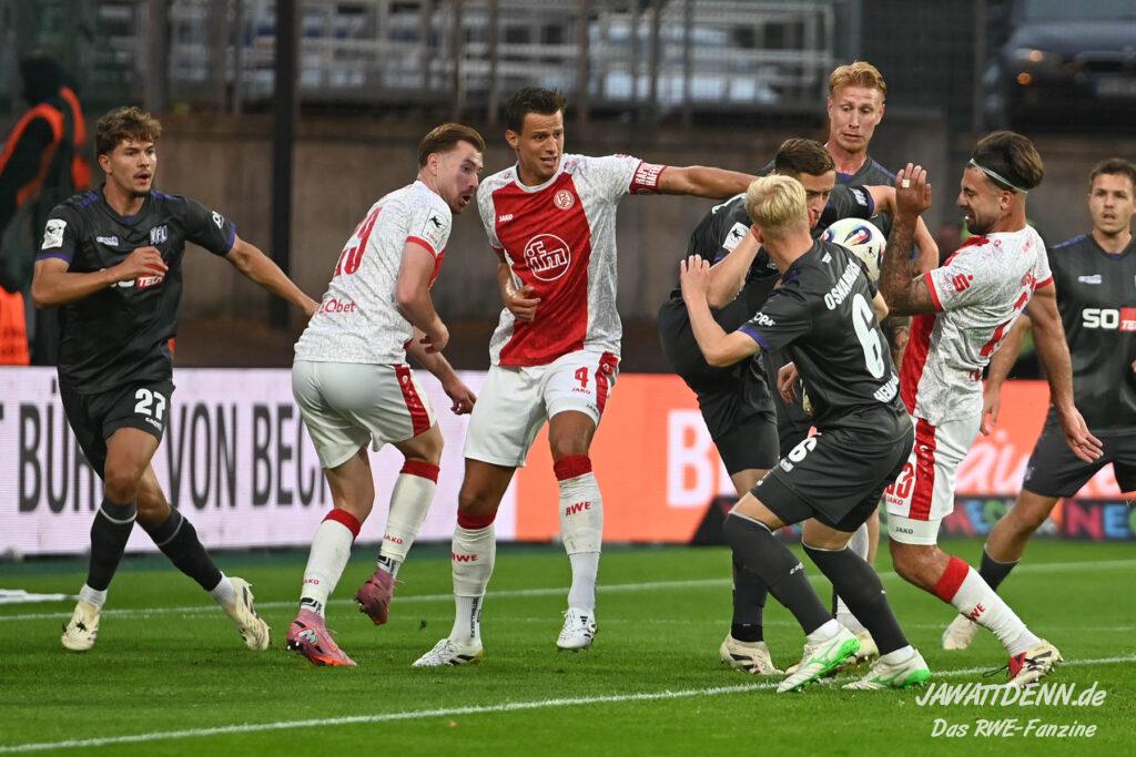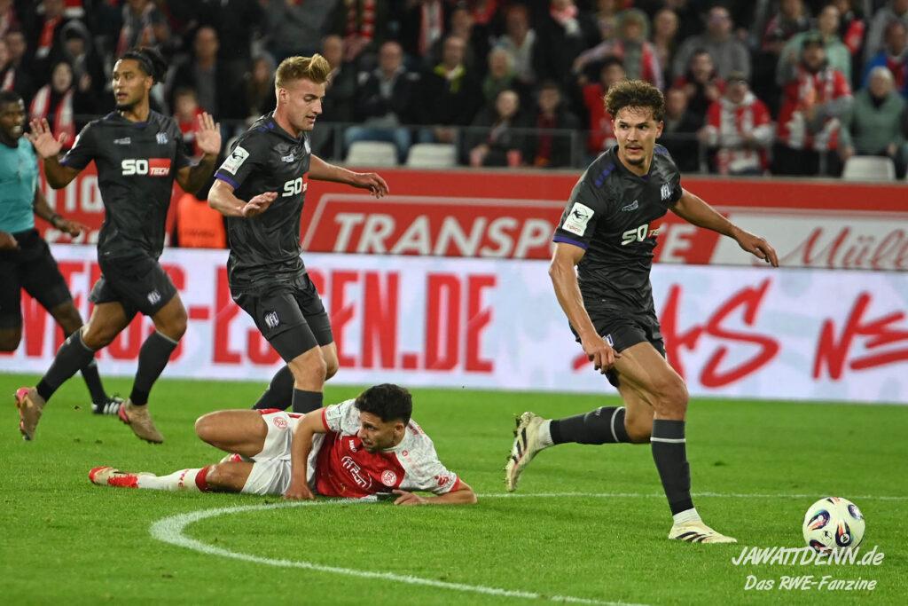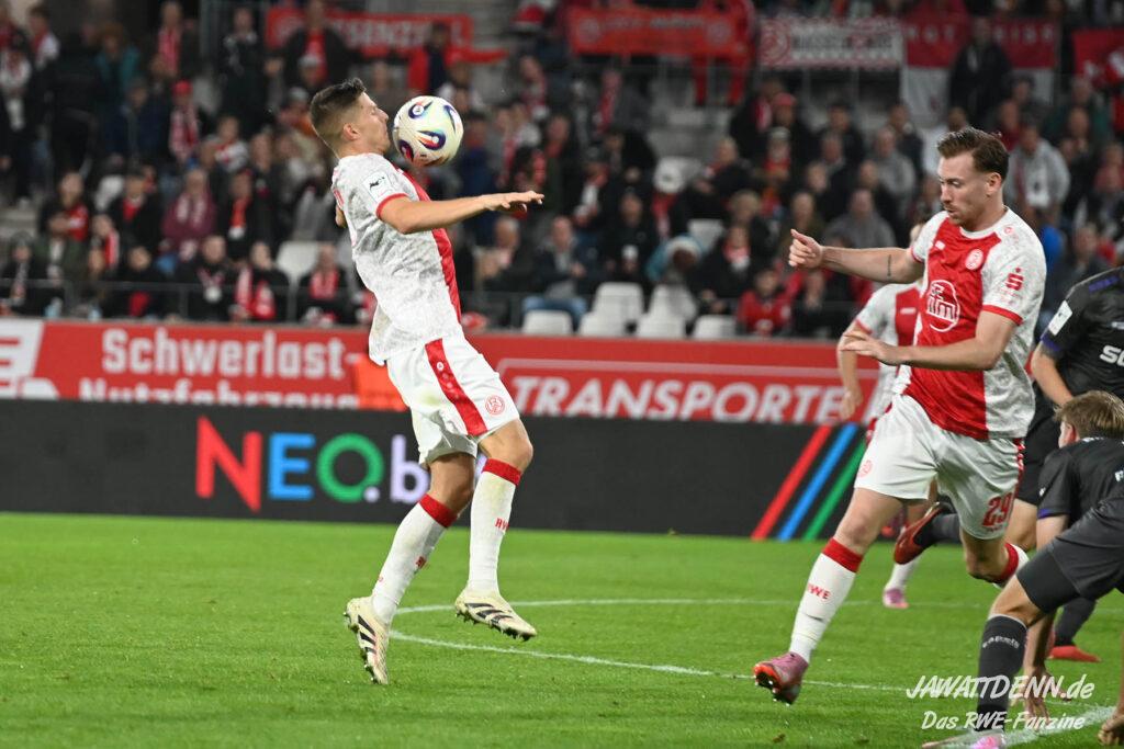 Das vierte Heimelfmetergegentor in Folge brachte RWE nur kurz auf die Verliererstraße, denn Tom Moustier antwortete zwei Minuten später, indem er eine verlängerte Ecke am langen Pfosten aufnahm und in die Maschen drosch – das zweite Saisontor für den Franzosen, der damit seine Vorjahresausbeute bereits verdoppeln konnte.