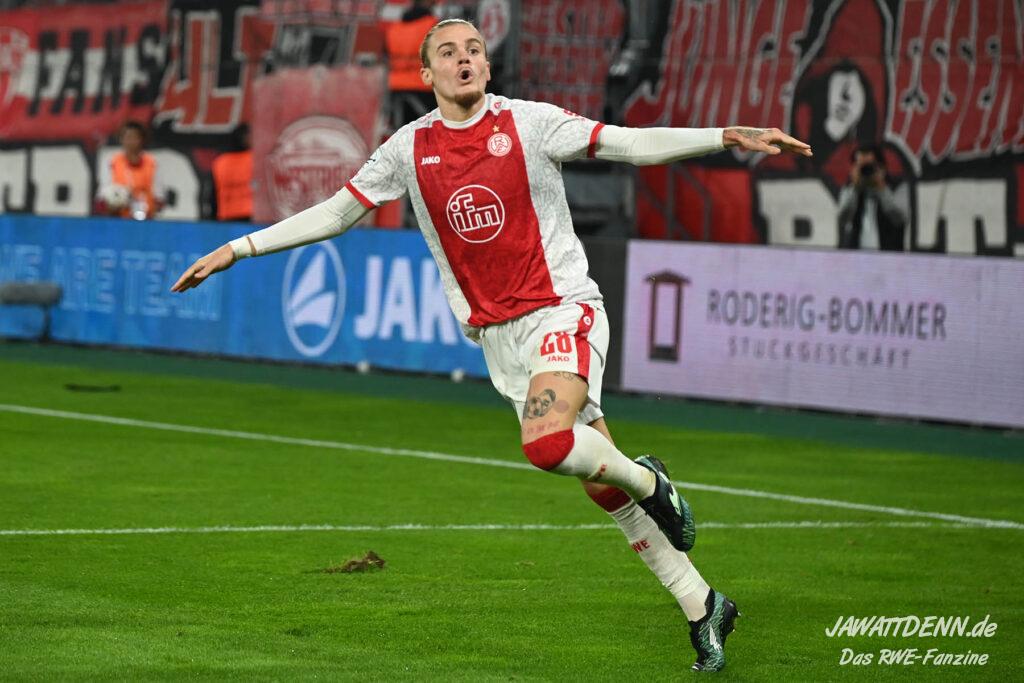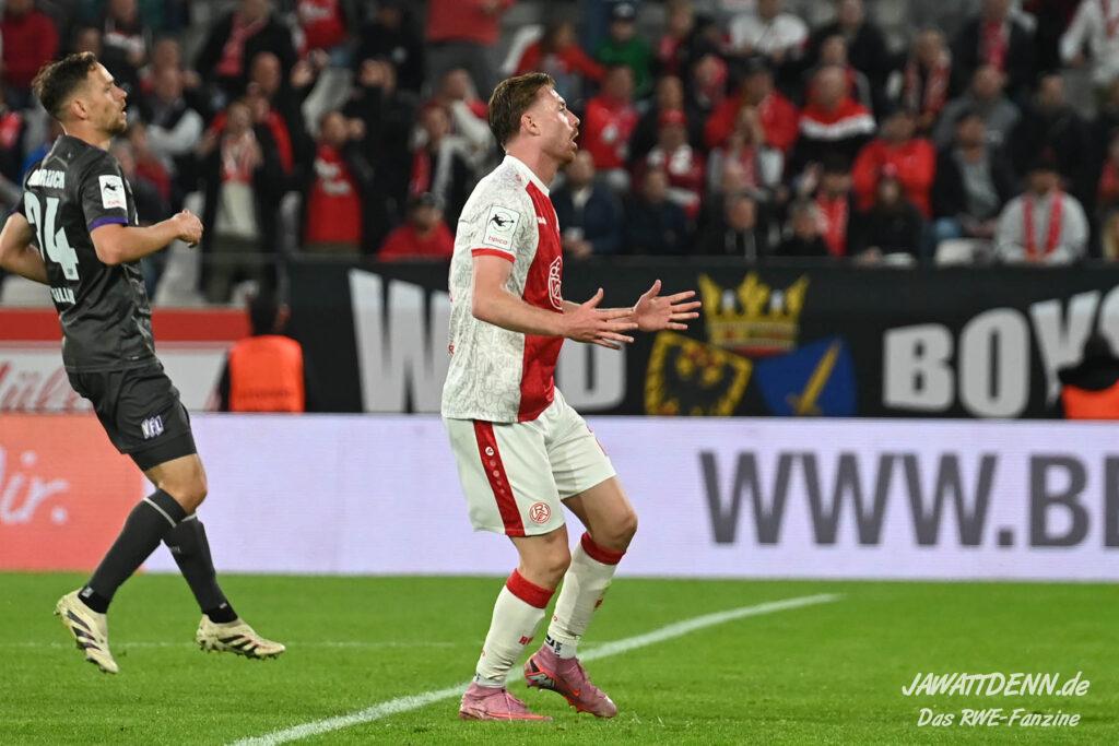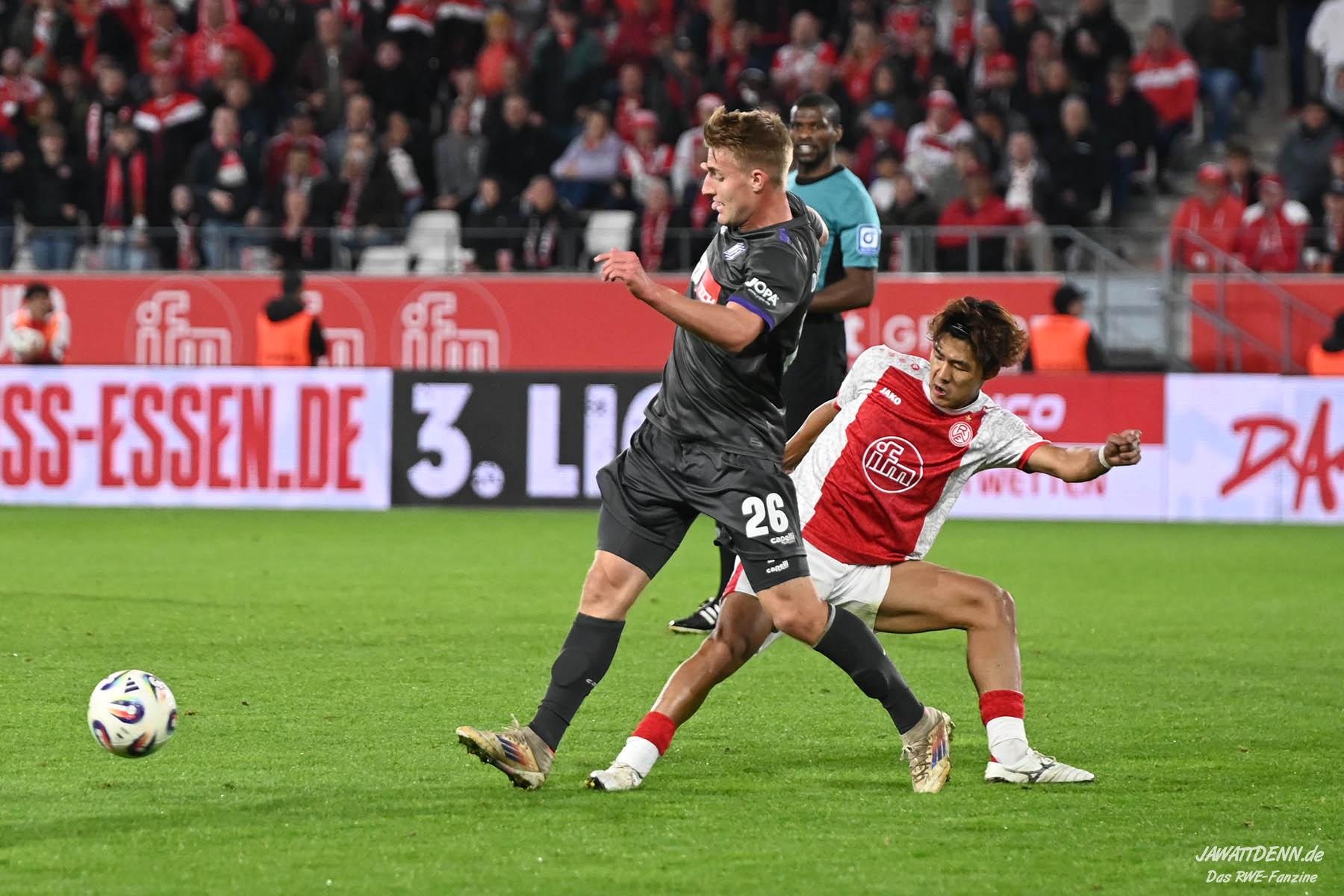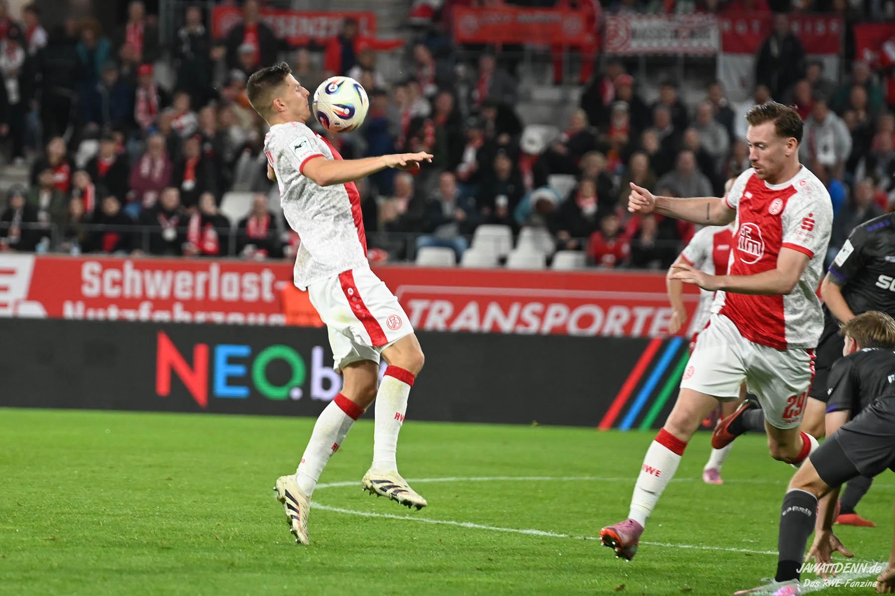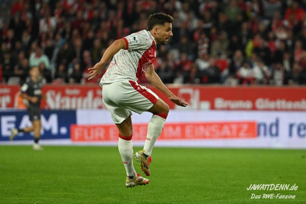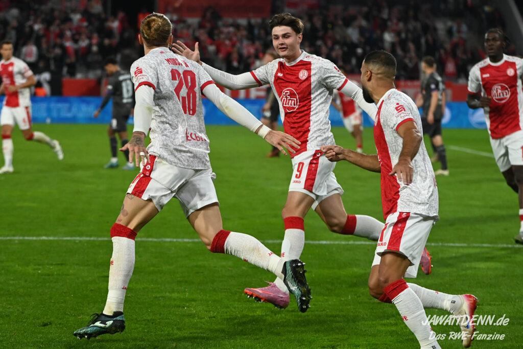 Das vierte Heimelfmetergegentor in Folge brachte RWE nur kurz auf die Verliererstraße, denn Tom Moustier antwortete zwei Minuten später, indem er eine verlängerte Ecke am langen Pfosten aufnahm und in die Maschen drosch – das zweite Saisontor für den Franzosen, der damit seine Vorjahresausbeute bereits verdoppeln konnte.