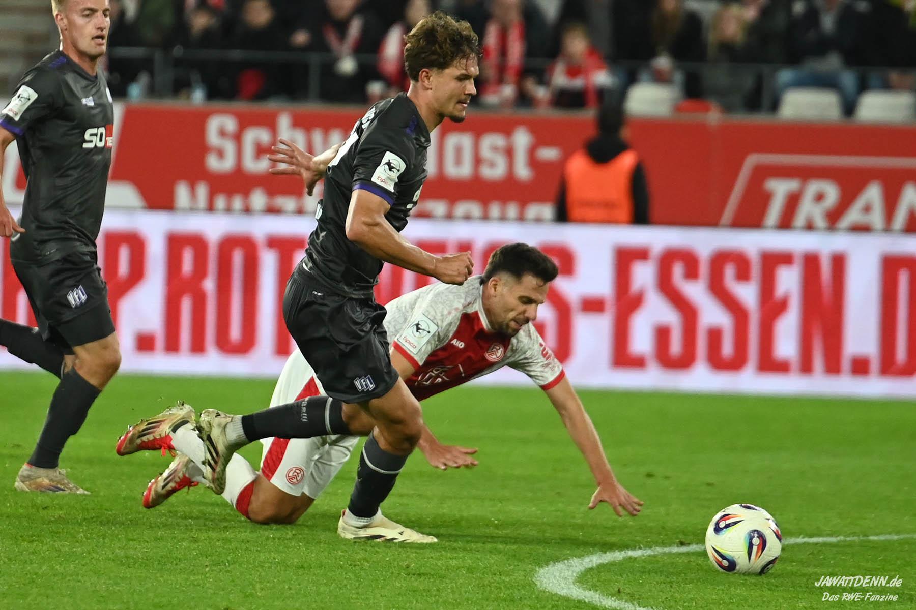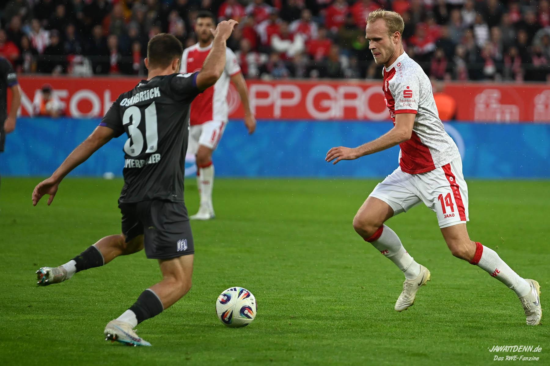 Der VfL hatte großen Respekt vor der Essener Offensive, doch der Respekt beruhte auf Gegenseitigkeit und RWE wollte den Gästen nicht den Gefallen tun, hochstehend in Ballbesitzphasen das Risiko zu erhöhen und durch Ballverluste Räume anzubieten, die vor allem Kai Pröger für sein Spiel benötigt. Angesichts der beiden nicht gewonnen Heimspiele zuvor herrschte bei Teilen des Anhangs jedoch die Ansicht vor, dass Koschinat gegen die tiefen Osnabrücker mehr ins Risiko hätte gehen können oder sogar müssen. Statt eines Torchancenfeuerwerks gab es aus dem Spiel heraus folgerichtig nur eine Handvoll Möglichkeiten und zwei Standardtore – kein Wunder, dass die lobenden Worte für das Spiel daher von den Defensivakteuren Gjasula und Rios Alonso kamen, die mit ihrer Leistung sehr zufrieden sein können.